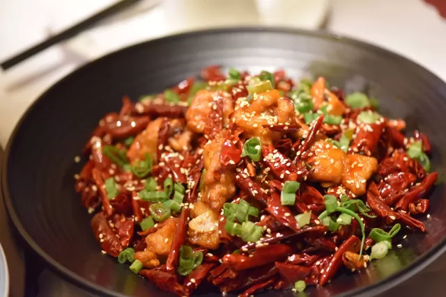 Pollo con Chile de Chongqing: Te enfrentarás a un espectáculo de sabor y apariencia. Este plato es un ícono de la cocina de Sichuan. Pedazos pequeños de pollo se marinan, se fríen hasta quedar increíblemente crujientes y luego se saltean en el wok con una montaña de chiles rojos secos y granos de pimienta de Sichuan. El arte del plato consiste en "encontrar el pollo en el mar de chiles". Los chiles están principalmente para dar aroma y agregar picante, no para comerse enteros. El pollo en sí es entumecedor, picante, crujiente y completamente adictivo. Es perfecto como pasabocas para acompañar una cerveza fría.