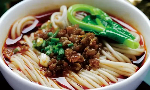 Son uno de los platillos callejeros más famosos de Sichuan. Los fideos frescos y delgados hervidos se sirven en una salsa sabrosa y picante, cubiertos con cerdo crujiente y maní. Simplemente revuelves todo con unos palillos para cubrir los fideos con un poco de cada cosa y ¡a comer! La salsa ahumada, picante y que adormece la boca shockeará tus papilas gustativas, dejándote con ganas de más. En los restaurantes de China, suele servirse como snack en un bowl pequeño, a menudo inmerso en un caldo rojo y espeso hecho con aceite de chile.