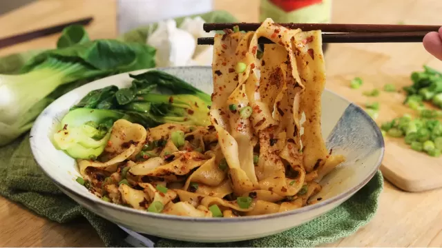 Estos se encuentran entre los fideos más anchos y espectaculares de la cocina china, famosos por el sonido "Biang! Biang!" que hace la masa al golpearse contra la mesa de preparación. Un solo fideo puede medir más de un metro de largo y ser tan ancho como un cinturón. Se hierven hasta quedar al dente, luego se sirven en un bowl cubiertos con generosas cantidades de ajo crudo, polvo de chile y cebollín picado. El final dramático implica que se vierta un cucharón de aceite ardiente directamente sobre los toppings, que chisporrotea y fríe las especias al instante, liberando un aroma increíble y creando una salsa poderosa, sabrosa y picante que cubre los fideos gruesos. Es una comida callejera contundente que es tanto una performance visual como un deleite culinario.