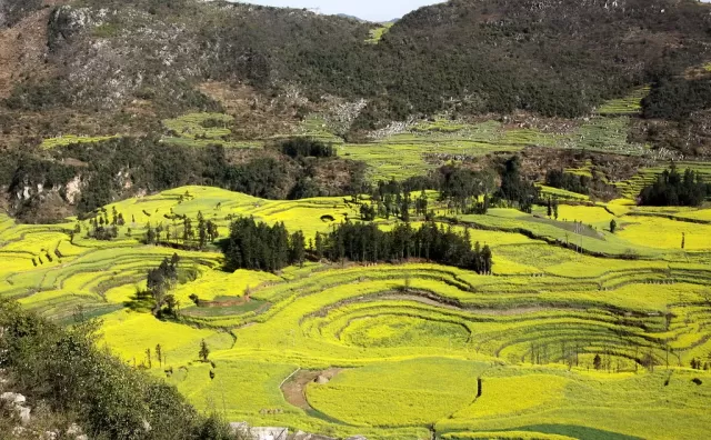 En el condado de Luoping, famoso por sus colinas kársticas, se encuentra la pequeña aldea de Niujie. El mejor momento para visitarla es entre febrero y marzo, cuando los interminables campos de colza florecen en todo su esplendor, creando un mar amarillo en terrazas que recuerdan a los arrozales.
