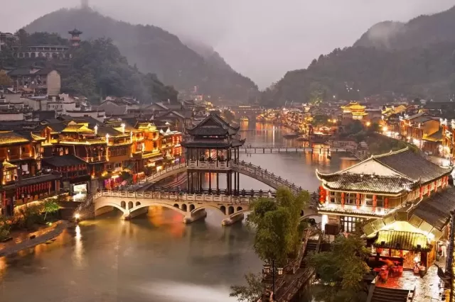 Rodeada por montañas verdes y atravesada por el río Tuojiang, la ciudad antigua de Fenghuang fue descrita como la más bella de China por el escritor Rewi Alley. Aquí podrás sumergirte en la cultura del pueblo Miao, visible en las casas de madera sobre pilotes ('diaojiaolou') que bordean el río y en las telas de batik que se venden en las tiendas. Prueba delicias locales como los pimientos rojos en escabeche picantes o los dulces de jengibre. A pocos kilómetros al oeste, visita el Castillo de Huang Si Qiao, la fortaleza de piedra mejor conservada de China, construida en el año 687.