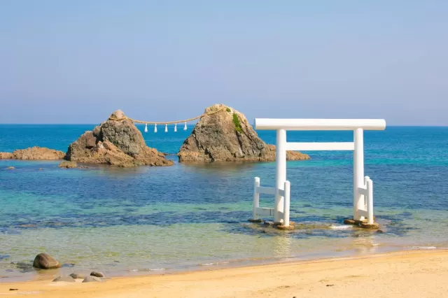 Al norte de la ciudad de Itoshima, dentro del Parque Cuasi Nacional Genkai, se encuentra Futamigaura. El atractivo principal de este lugar son las dos rocas que están una al lado de la otra como una pareja, estos son en realidad dos islotes gemelos que emergen a 150 metros de la orilla, unidos por una gruesa soga shimenawa sagrada. Este símbolo de unión es el corazón de santuario Sakurai, un lugar de culto fundado por el clan Kuroda y que otorga a la zona su nombre alternativo: Sakurai-Futamigaura. Un detalle que hace la atmósfera de esta playa aún más especial es que también se encuentra un Tori blanco que en contraste con el azul del océano le da un toque espiritual al paisaje.