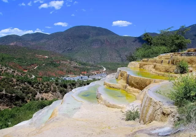 Estas terrazas no son de arroz, sino de piedra caliza. Se encuentran en la base de la montaña nevada Haba, a unos 100 kilómetros del condado de Shangri-La, a 2,380 metros de altitud. Se formaron durante miles de años por la deposición de carbonato de calcio que llevan las aguas termales, creando piscinas naturales en forma de terrazas. Cubren un área de unos tres kilómetros cuadrados y son las terrazas de manantial más grandes de China. Puedes llegar en autobús desde Shangri-La hasta el condado de Sanba (unas 4 horas) o en lanzaderas desde Lijiang. Puedes visitarlas durante todo el año. La temperatura aquí es similar a la de la ciudad de Shangri-La, pero ligeramente más baja.