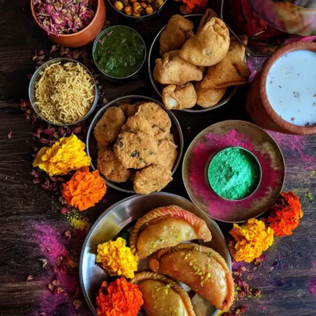 Una celebración india nunca estaría completa sin un banquete delicioso. Holi es una oportunidad para disfrutar de manjares especiales. Los hogares y las calles se llenan del aroma de dulces como gujiya (empanadillas fritas rellenas de coco y frutos secos), jalebi (espirales de masa frita bañadas en sirope) y malpua (una especie de pancake indio). Para calmar la sed bajo el sol de marzo, nada mejor que un lassi (yogur batido) o un thandai, una bebida fría y dulce de leche infusionada con almendras, cardamomo, azafrán y pétalos de rosa, que a veces se mezcla con bhang (una preparación de cannabis), una práctica tradicional en algunas regiones.