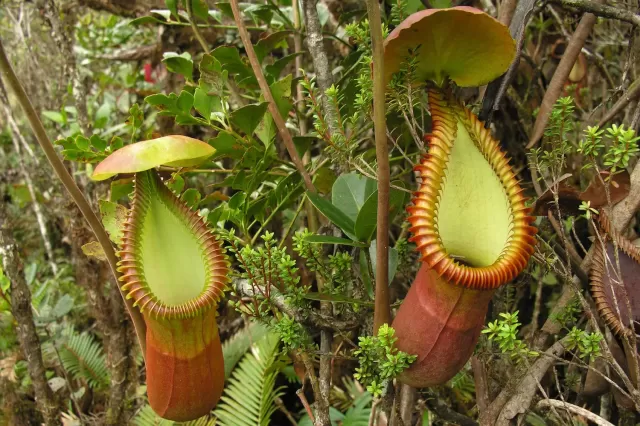 Endémica de las montañas de Sabah, la Nepenthes rajah es la especie de planta jarra más grande conocida. Sus jarros pueden contener hasta 3.5 litros de agua y enzimas digestivas. Su tamaño es tan grande que se han documentado casos de pequeños mamíferos, como ratas y musarañas, cayendo en su trampa y siendo digeridos. Sin embargo, también mantiene una relación mutualista con la musaraña de árbol de Borneo (Tupaia montana), que se alimenta del néctar de la tapa y defeca en la jarra, proporcionando nutrientes.