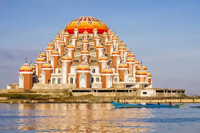 Situada a orillas del gran río Mahakam, esta mezquita es un icono de Samarinda, en Kalimantan Oriental. Es una obra maestra de la arquitectura con siete minaretes imponentes y una cúpula principal adornada con patrones florales, inspirada en la mezquita de Santa Sofía en Estambul. Su suelo de cerámica bordeado con granito aporta una sensación de lujo al interior. La vista del complejo desde el cercano Puente de Mahakam es simplemente impresionante.