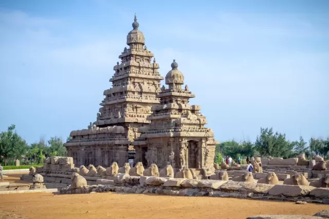 Este grupo de santuarios, fundado por los reyes Pallava, fue tallado directamente en la roca a lo largo de la costa de Coromandel entre los siglos VII y VIII. Es famoso por sus rathas (templos en forma de carros), mandapas (santuarios cueva) y relieves al aire libre como el conocido 'Descenso del Ganges'. El templo de Rivage cuenta con miles de esculturas dedicadas a la gloria de Shiva.