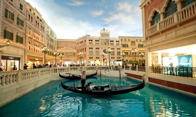 Un hotel de pintoresca apariencia. Entrar aquí es como ser transportado a Venecia. El interior es una recreación gigantesca de canales, puentes y plazas de apariencia italiana, todo bajo techo y con un cielo artificial siempre azul. Puedes dar un paseo en góndola por los canales, ir de compras en su enorme centro comercial (el más grande de Macao) o simplemente maravillarte con la extravagancia del lugar. Aquí también se encuentra el casino más grande de la ciudad. Visítalo por la experiencia, pero recuerda jugar con responsabilidad.