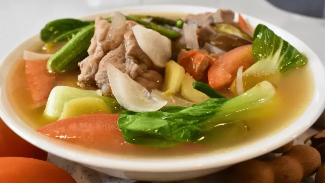 Es un clásico de sopa agria. El caldo, típicamente acidulado con tamarindo, se llena con diversas verduras y la carne que elijas. Las variantes populares son sinigang na baboy (cerdo), sinigang na hipon (camarones) y sinigang na isda (pescado).