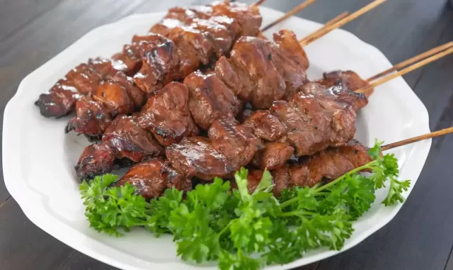 Este pincho de cerdo dulce es extremadamente popular al momento de la merienda. Funciona muy bien con arroz blanco en las comidas, pero también es perfecto para comprar por la tarde en un puesto callejero.