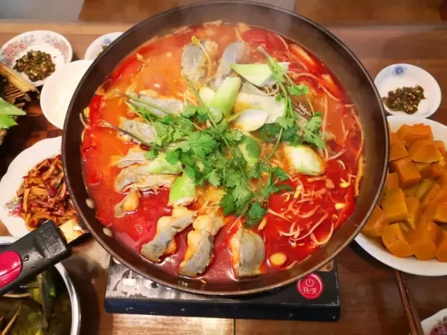 Por otro lado, en el extremo suroeste se encuentra Yunnan. El hotpot de Yunnan celebra la increíble biodiversidad de la provincia. Ofrece caldos más ligeros y fragantes, a menudo perfumados con hierbas frescas como la menta (un elemento básico aquí) y flores comestibles. Los ingredientes suelen ser muy variados: van desde carnes , setas silvestres, hasta pescados de río y vegetales locales. La magia también está en las salsas para mojar: una explosión de opciones donde el aceite de sésamo y diferentes tipos de chile se combinan creativamente. Y no te sorprendas si ves platos como ensalada de menta fresca o incluso grillos fritos al estilo Yunnan como acompañamientos únicos.